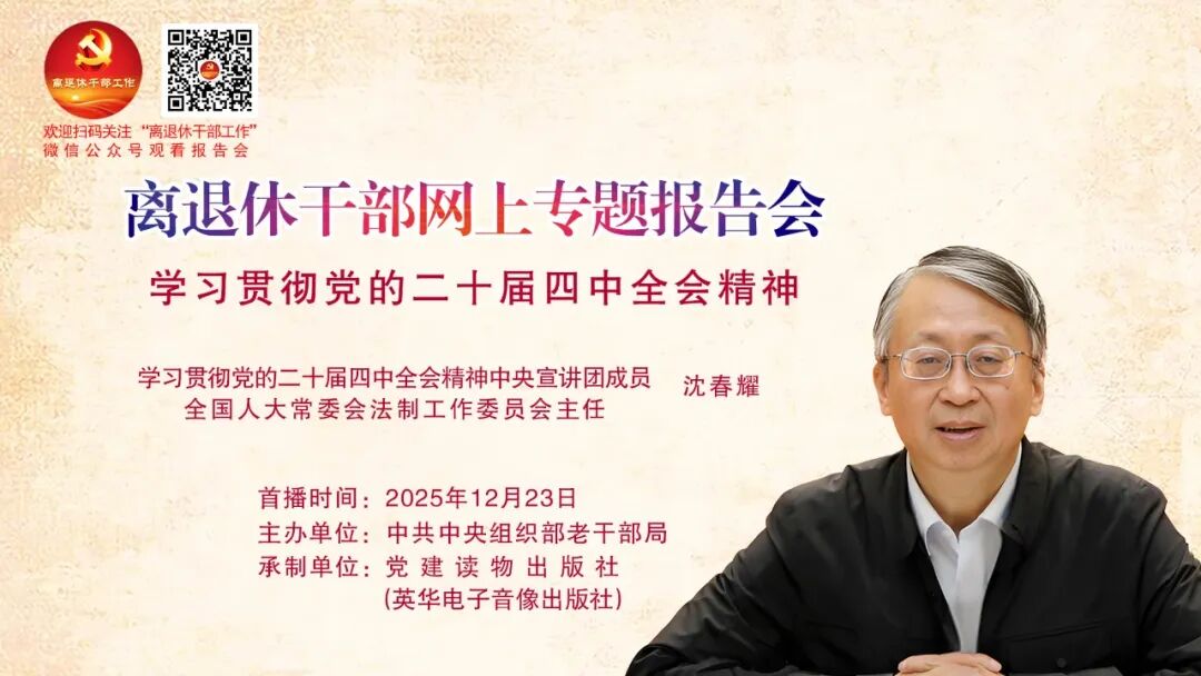 报告会将于12月23日在“离退休干部工作”微信公众号发布,欢迎广大离退休干部和老干部工作者扫码关注“离退休干部工作”微信公众号收看!